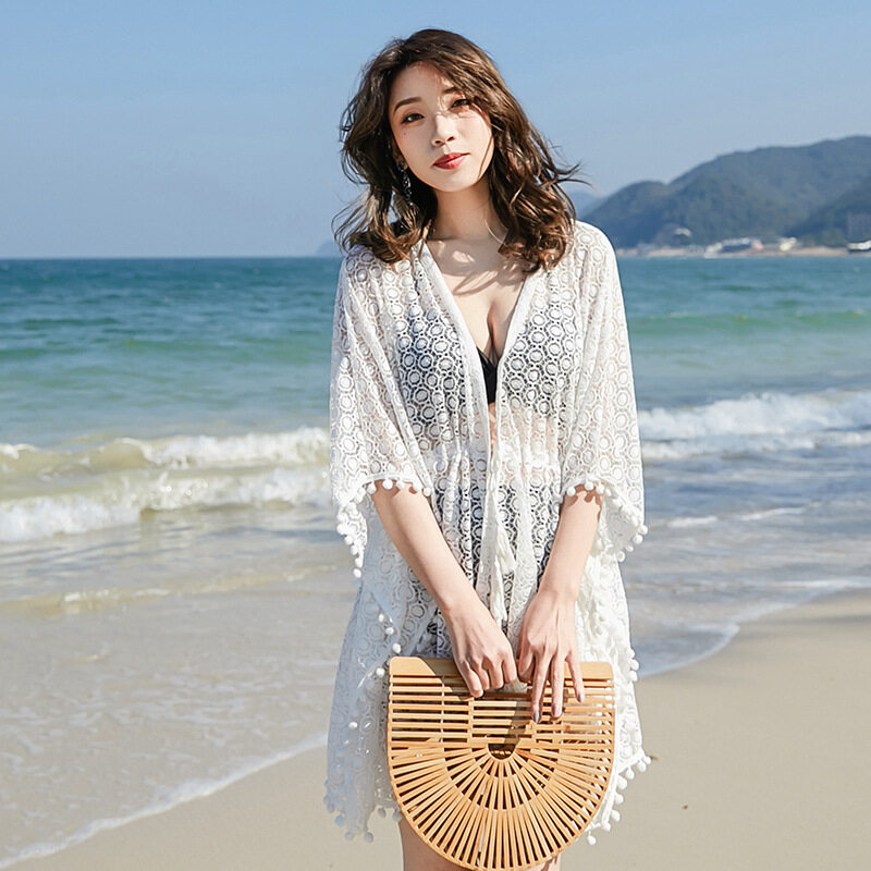 Adisputent Sexy Crochet Beach Cover up Tassel Tie Beachwear Tunic Long Pareos Summer Swimsuit See-through Beach Dress Bikini