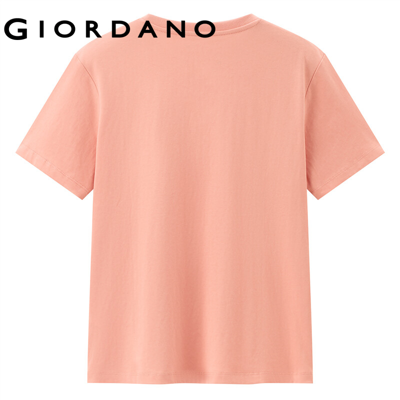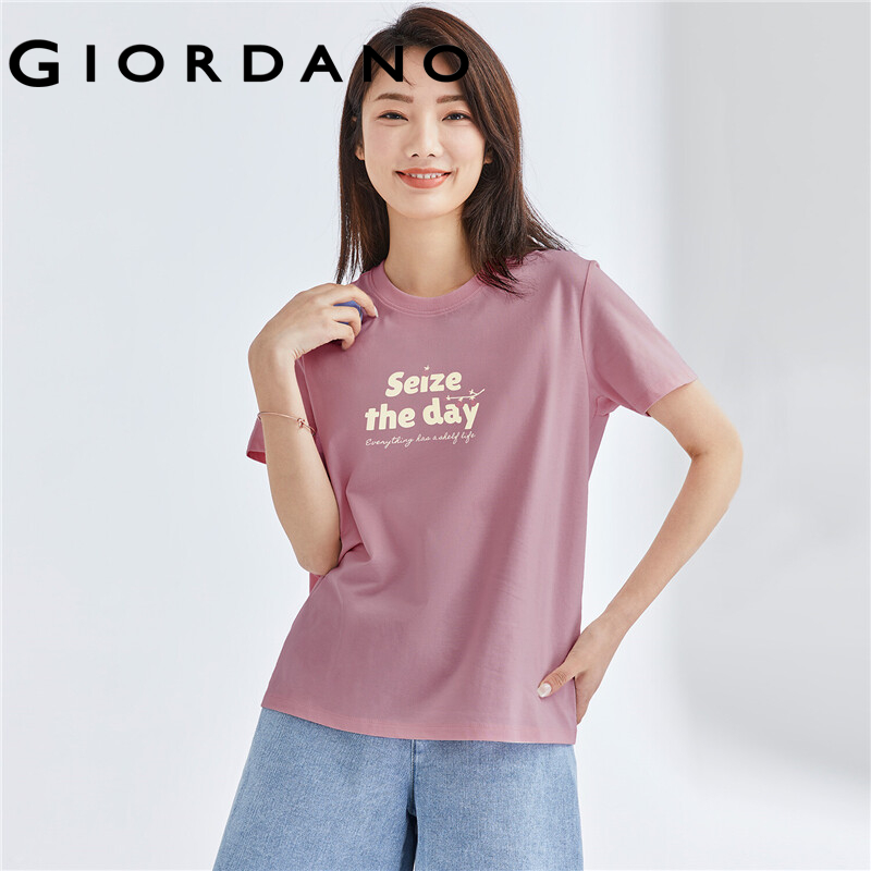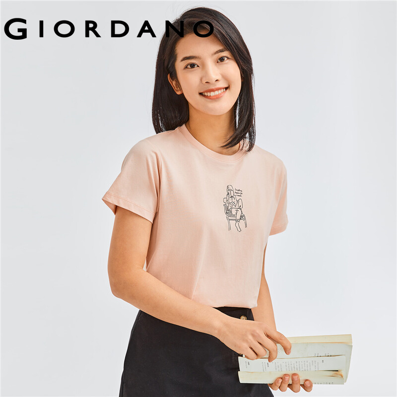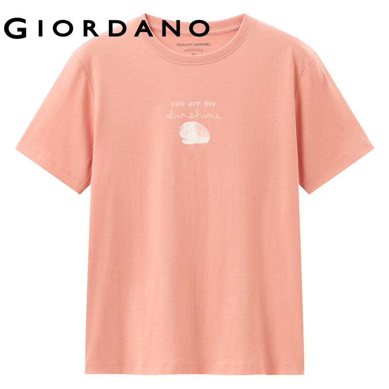 GIORDANO Women T-Shirts Fashion Printed Smile Face Cotton T-Shirts Summer Short Sleeves Ribbed Crewneck Basic T-Shirts 13391010
