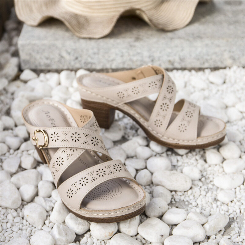 U-COZY Block Heeled Sandals Women Slip-on Cross Cutout Heels Wedges