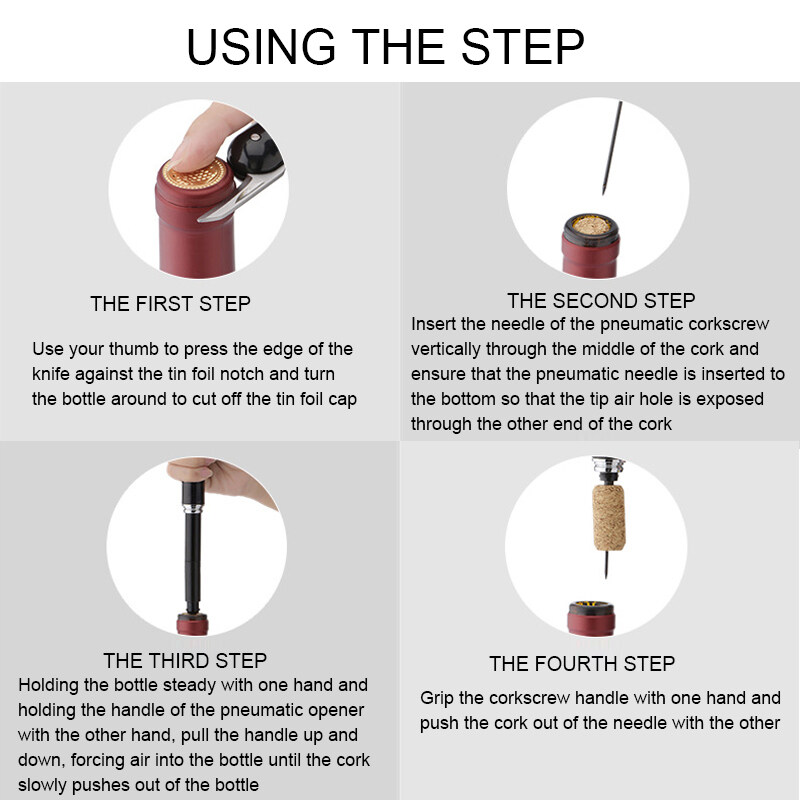 * Easy to use: This air pump wine opener is a simple, easy and fast way to open up a bottle of wine without the hassle of pulling and twisting, simply slid the needle in, pump a few times and the cork is out.