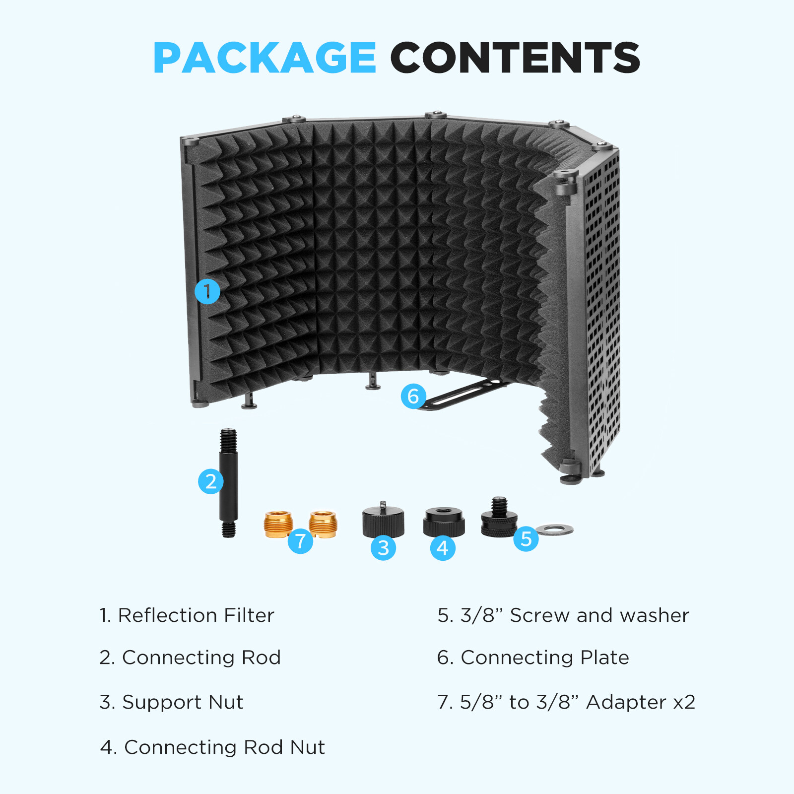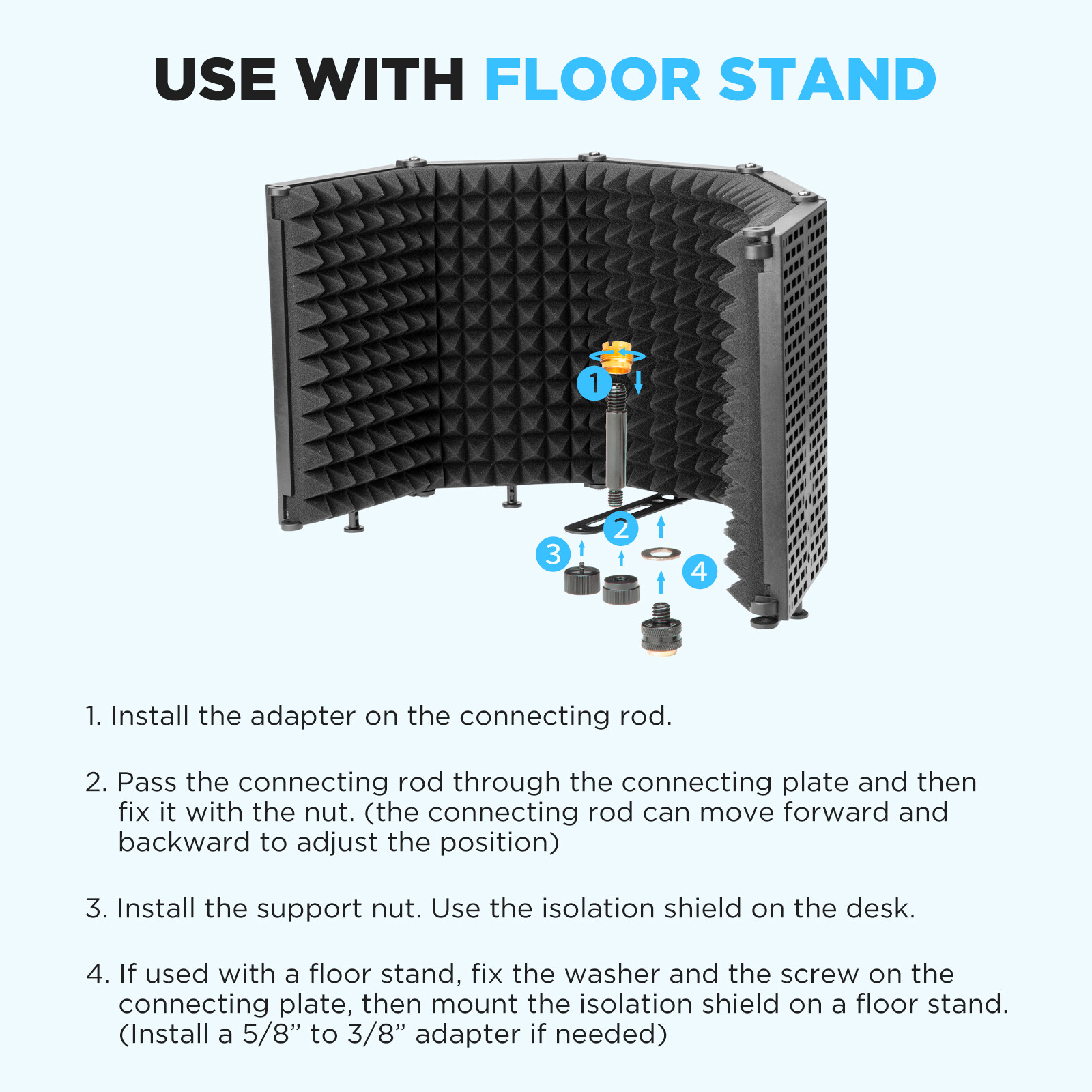 The BY-RF5P is designed with a long and narrow connecting plate, and equipped with essential accessories. All of them are useful on microphone mounting and boom attaching. Users can set the connecting rod on the connecting plate and mount a microphone on the rod through the 5/8" screw hole on the bottom of the microphone or through the 3/8" screw hole and a 5/8" to 3/8" adapter. And the booms or stands can be attached to it easily. In addition, the shield is designed with four support legs. These legs make it can stand independently on the desktop, which is very useful when you create your works on the table.