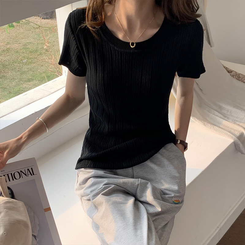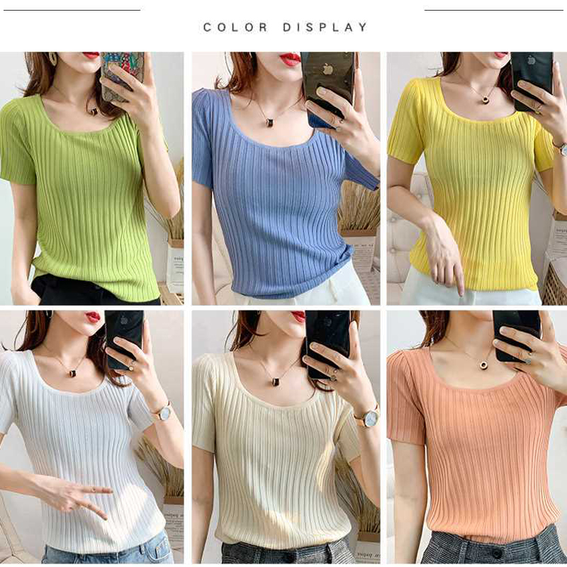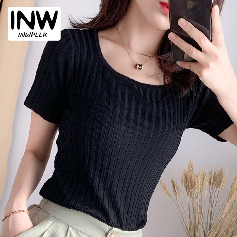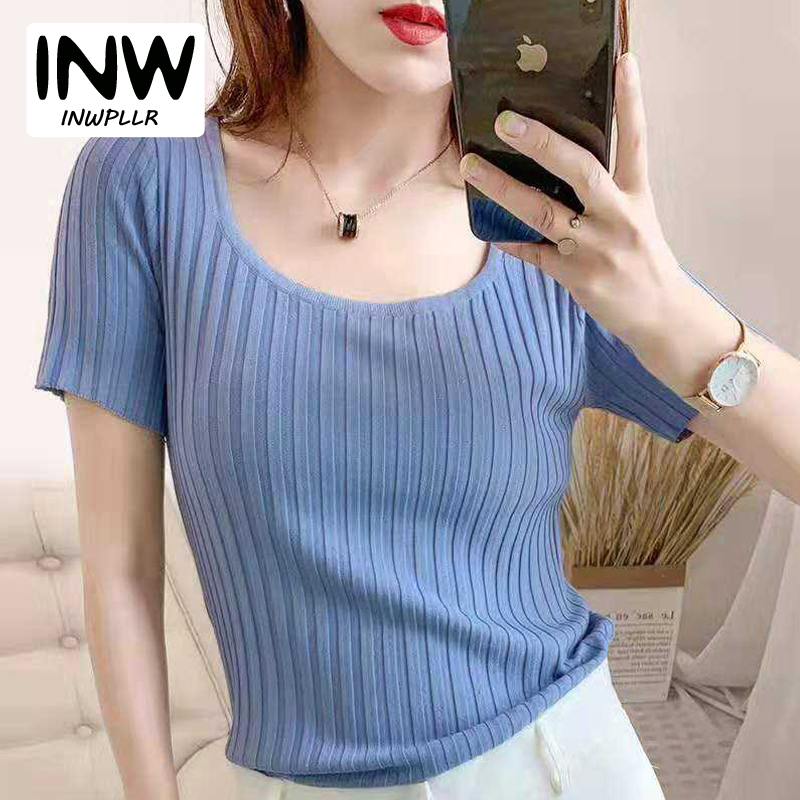 INWPLLR Ice Silk Knitted T-shirts Women Short Sleeved Square-neck Tops Summer All-match Simple Solid Tshirt Ladies