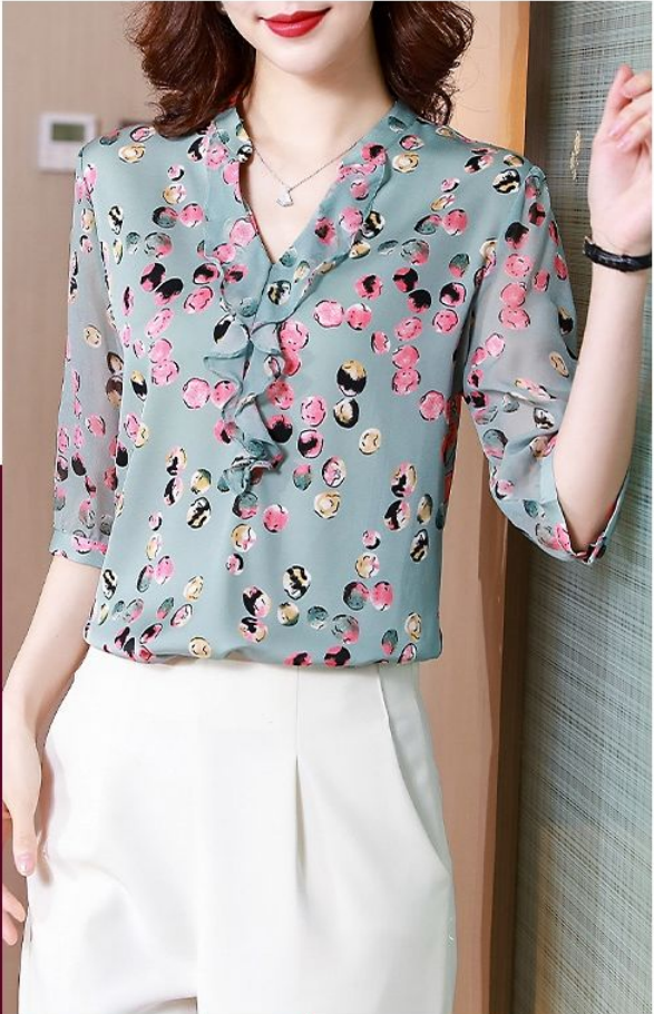 EDQRDQ Women's Stretchy Ruffle V Neck 3/4 Sleeve Slim Solid Elegant Chiffon Blouse Top