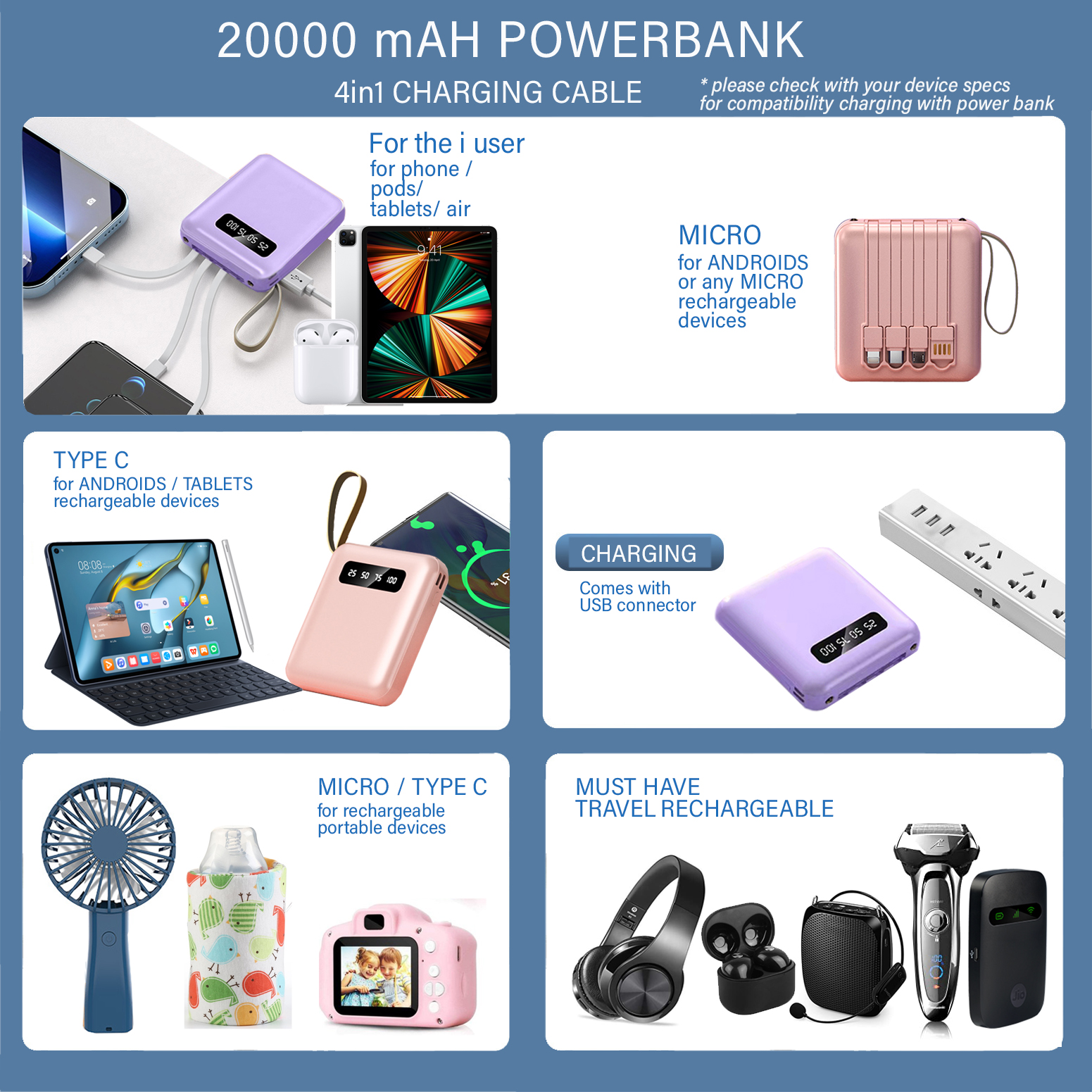 Mini Power bank 20000mAh with 4in1 DETACHABLE Cables Powerbank with LED Torch Light