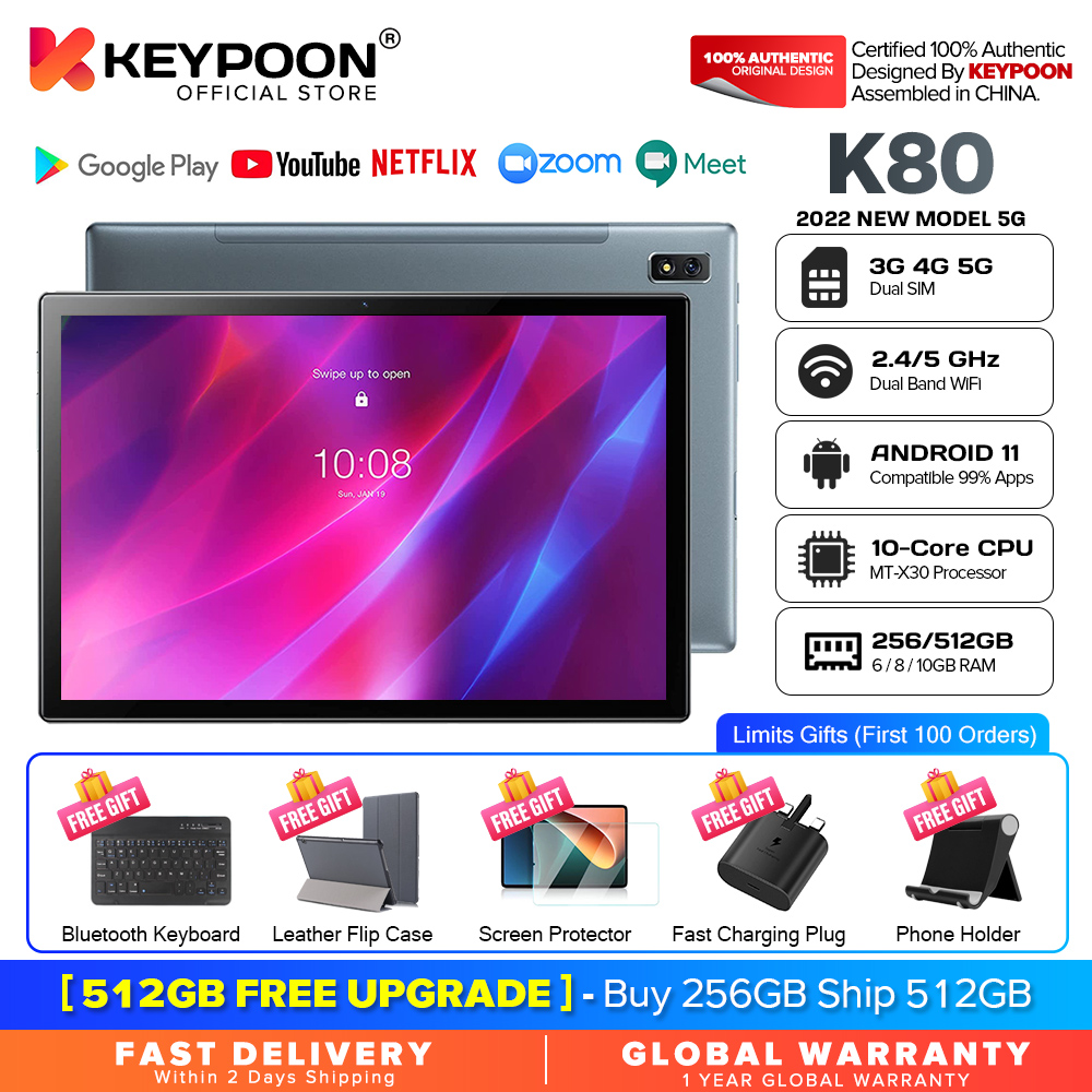 BRAND PROMOTION: 【Buy 256GB Ship 512GB】- Customer just need to order 8GB+256GB variant, then seller will auto ship 10GB+512GB without paying price difference. Limited Quantity Offer 100pcs for sales ONLY!!! WARRANTY: 【1 Year International Warranty】- Comes with KEYPOON Official warranty card. We support 1 year free item warranty, in case the item getting any issue without non-aritificial damages, we can repair and even give 1to1 exchange new item. PRODUCT FEATURE: 【SUPERIOR WATCHING EXPERIENCE】KEYPOON K80 Tablet is powered by 10-Core Processor. 2022 upgraded Android 11 tablet provides + 40% faster processing speed than regular Quad-Core. 10.1-inch Tablet screen size with 1920x1200 resolution support, perfect for home entertainment and office. DUAL-BAND WI-FI】The 2022 KEYPOON K80 Built-in Dual-band wifi module, Support 2.4/5Ghz wifi, the faster wifi you get, the more stable wifi for your smoother watching movie experience. 【DUAL-SIM】The 2022 KEYPOON K80 Tablet support dual SIM feature, support 3G/4G/5G netowrk, and also support phone call feature. All-in-One Tablet that make your life experience be more easier and convenient. 【BIGGER THAN BIGGER】The tablet has 8GB RAM, 256GB/512GB internal storage. The GMS Certified latest Android Tablet, with basic Google apps already on and without bloatware. Get rid of unexpected ads and download apps from Google Play, such as SKYGO, NetFlix, YouTube and more. 【LONG LASTING BATTERY】Equipped with a long-lasting and environmentally compliant 8800 mAh battery, this 10-inch tablet will effortlessly provide you with up to 8 hours of support for reading, browsing, watching movies and playing games. The long-lasting battery life and lightweight design allow you to enjoy your tablet anywhere, anytime. 【DUAL CAMERAS AND SPEAKERS】With front 5 MP & Rear 13 MP dual cameras, which would bring your excellent photos and clear video chats. Dual speakers are designed to provide high-quality and powerful sound for your favorite music, games and videos. SPECIFICATIONS: Model: KEYPOON K80 (2022) CPU: X30 10-Core System: Android 11 (System Upgradable) Screen Size: 10.1 Inches IPS Screen Screen Resolution: 1920 * 1200 WiFi: Dual Band 2.4G/5Ghz WiFi Bluetooth: BT 4.0 Battery: 8800mAh Li-on Battery Camera: Front 5MP + Rear 13MP Speaker: Dual Stereo Speaker RAM: 6GB/8GB/10GB ROM: 128GB/256GB/512GB Cellular: 3G/4G/5G DUAL SIM Charging Port: Type C WHAT'S IN THE BOX: 1 * Tablet PC 1 * User Manual 1 * Type C Cable 1 * SIM Card Pin 1 * Official Warranty Card SPECIAL FREE FITS: 1 * Leather Flip Case (Limited Gifts) 1 * Bluetooth Keyboard (Limited Gifts) 1 * Tempered Glass Screen Protector (Limited Gifts) 1 * OTG Converter (Limited Gifts)