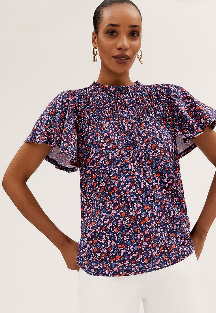 M&S Pure Cotton Floral Shirred Short Sleeve Top
