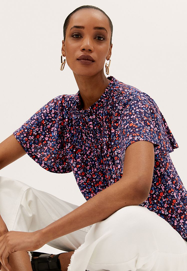 Bring a floral pop to your ensemble with this pure cotton top. Regular fit, with a shirred front panel and short ruffled sleeves for a fluttery feel. Crew neck gives a classic look. M&S Collection: easy-to-wear wardrobe staples that combine classic and contemporary styles.
