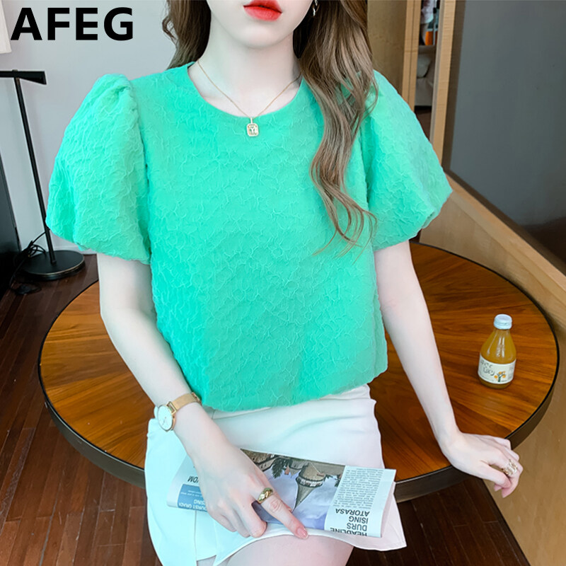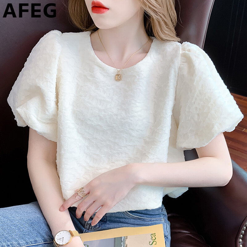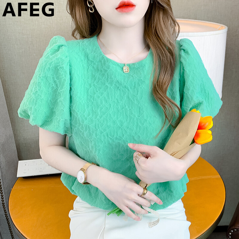 AFEG new Korean version round neck pleated fashion loose all-match mesh puff sleeve blouse for women