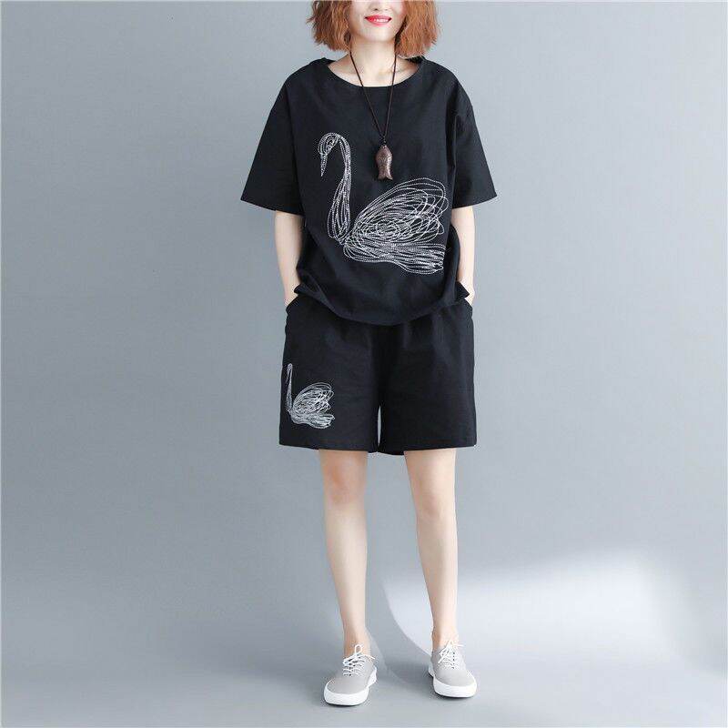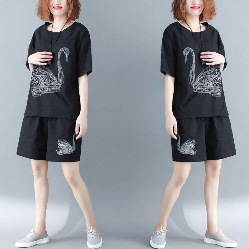 2021summer Fat Women's Sportswear Short-Sleeved Shorts New Embroidered Loose Large Size Slimming for Plump Girls Two-piece Set
