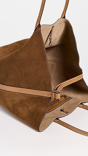 Strap at the top right secures with a D-ring at the top left to create a trapezoid-shaped silhouette